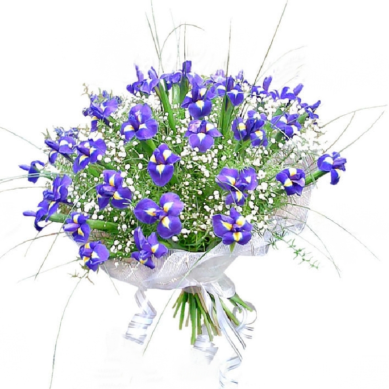 Букет состоит из 31 ирис, 4 ветки гипсофилы, зелень, красивая упаковка, атласная лента.